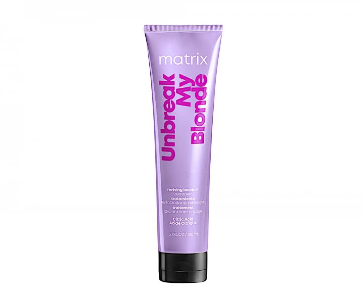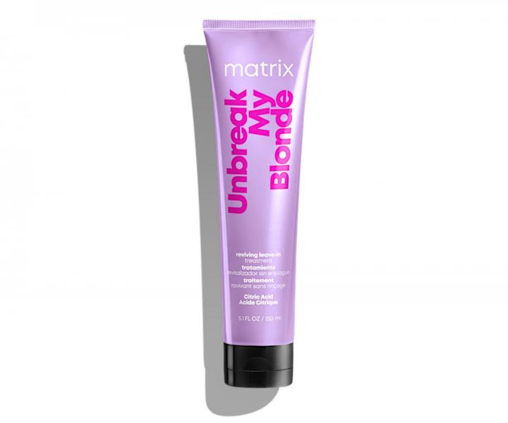 Bezoplachová stimulujúca starostlivosť Matrix Unbreak My Blonde Total Results pre všetky typy zosvetlených vlasov dodáva vlasom ešte väčší hydratáciu a výživu vďaka obsahu kyseliny citrónovej. Vlasom poškodeným v dôsledku zosvetľovania je vrátený zdravý lesk, hebkosť a zamatový vzhľad. Stimulujúca starostlivosť predchádza lámaniu vlasov spôsobenému zosvetľovaním. Vlasy sú posilnené, bez toho aby došlo k ich zaťaženiu.