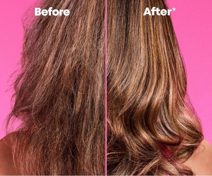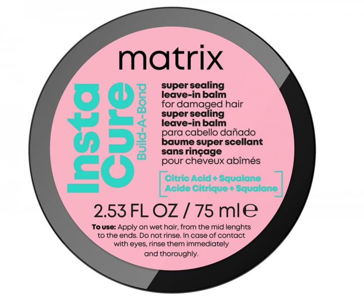 Bezoplachový zacelujúci krém Matrix Instacure Build-A-Bond Super Sealing Leave-In Balm viditeľne obnovuje aj veľmi poškodené vlasy. Jeho bohatá, koncentrovaná textura sa ľahko vstrebáva a rovnomerne vyživuje vlasy od dĺžok až po končeky. S pomocou kyseliny citrónovej a skvalánu vytvára nové vlasové väzby, kyselina citrónová preniká hlboko do vlasových vlákien, kde ich posilňuje zvnútra a zanecháva ich až 8x pevnejšie, zatiaľ čo skvalan je okamžite uhladzuje a zanecháva sametovo hebký každý prameň. Krém navyše poskytuje ochranu proti krepateniu, vlhkosti aj teplu až do 230 °C, takže je ideálny na fénovanie, žehlenie aj ďalšie tepelné úpravy. Jeho ružová koncentrovaná textura zanecháva vo vlasoch nezabudnuteľnú vôňu osviežujúcich citrusových kvetov, ambrového dreva, fíg a sladkých pivoniek.