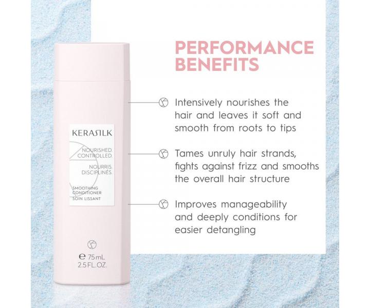Kondicionér Kerasilk Smoothing Conditioner má bohaté zloženie s obsahom biomimetického hodvábu a bambuckého oleja, ktoré intenzívne vyživuje a krotí nepoddajné, krepaté vlasy a vlasy vlnité alebo kučeravé. 100% vegánske zloženie dodáva vlasom potrebnú výživu a zanecháva ich hebké a hladké od korienkov až ku končekom, vyhladzuje štruktúru vlasového vlákna a intenzívne zlepšuje upraviteľnosť krepatých a nepoddajných vlasov. Výsledkom sú tak krásne hladké a hebké vlasy bez krepovatenia. Zanecháva vlasy lepšie rozčesateľné a upraviteľné. Kondicionér neobsahuje silikóny, sulfáty, farbivá, mikroplasty, minerálne oleje ani parabény.