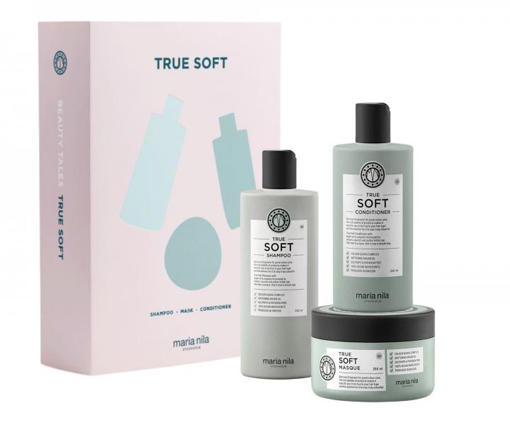 Šampón pre suché vlasy Maria Nila True Soft Shampoo zjemňuje a pritom posilňuje vlasy. Unikátna hydratačná receptúra dodáva vlasom vlhkosť, obmedzuje ich krepatenie a znižuje v nich statickú elektrinu. Vegánske zloženie obohatené o vzácny arganový olej súčasne vlasy vyživuje a revitalizuje. Color Guard Complex chráni vlasy pred UV žiarením a voľnými radikálmi a garantuje dlhšiu životnosť farby vlasov. Šampón je možné využívať každodenne. Zmyslový zážitok dotvára jemná kvetinová vôňa ľalie, ruže a jazmínu.
