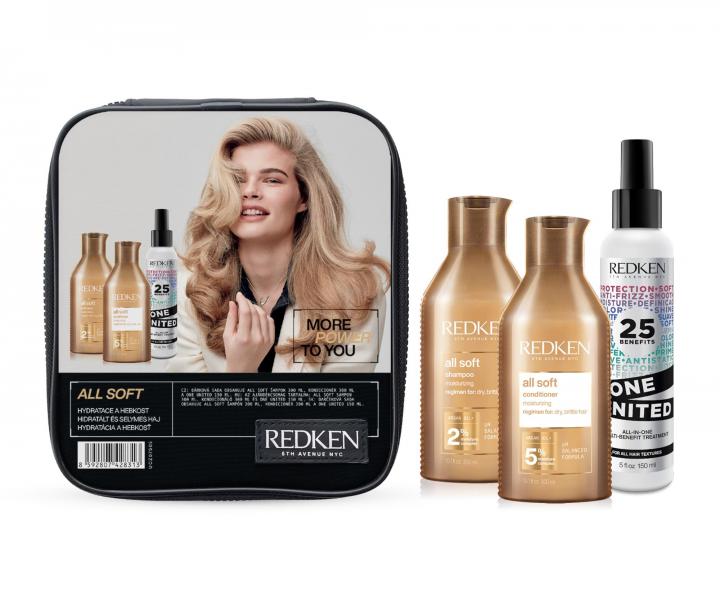 Darčeková sada pre hydratáciu a hebkosť vlasov Redken All Soft obsahuje: Vyživujúci šampón pre suché a krehké vlasy Redken All Soft - 300 ml Vyživujúca starostlivosť pre suché a krehké vlasy Redken All Soft - 300 ml Ošetrujúci sprej s 25 benefitmi Redken One United - 150 ml + Kozmetická taštička na zips 18 x 21 x 5,5 cm ZADARMO Vyživujúci šamp... viac »