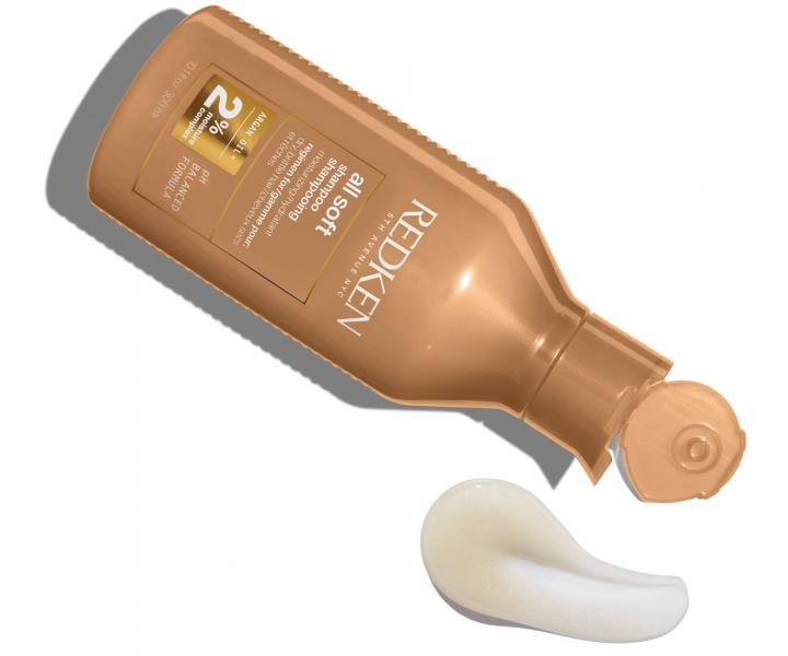 Vyživujúci šampón Redken All Soft je ideálny pre suché a krehké vlasy. Šetrne odstraňuje nečistoty, vyživuje a zanecháva vlasy hodvábne hebké, jemné, lesklé a poddajné. Znižuje lámavosť vlasov. Zloženie je obohatené o trojitý RCT proteínový komplex sa stará o všetky zóny vlasového vlákna (RCM = root - korienky, core - dĺžky, tip - končeky). Slúži ako prevencia pred štiepením končekov.
