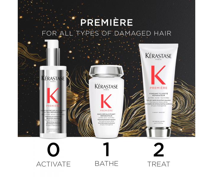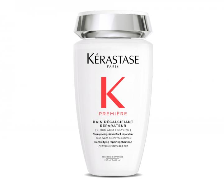 Bohatý šampón Kérastase Premiére Bain Décalcifiant Réparateur šetrne čistí vlasovú pokožku, a zároveň účinne odstraňuje z vlasov prebytočný vápnik a obnovuje všetky typy poškodených vlasov, od jemných až po silné. Poškodené vlasy kvôli svojej pórovitosti vstrebávajú z vody oproti zdravým vlasom 3x viac vápnika, ktorý sa dostáva medzi keratínové reťazce a ničí ich väzby. Tým dochádza k ďalšiemu poškodzovaniu vlasov, ich nepoddajnosti, tvrdosti a lámavosti. Prebytočný vápnik sa hromadí aj na povrchu vlasov, tie sú potom matné a hrubé na dotyk. Šampón vďaka obsahu organickej 8% kyseliny citrónovej pomáha s odstránením vápnika z povrchu aj jadra vlasového vlákna, čím eliminuje matnosť a nepoddajnosť vlasov. Aminokyselina glycín po odstránení vápnika z vlasov preniká do vnútornej štruktúry vlasového vlákna, kde sa stará o hĺbkovú obnovu, napravuje poškodené keratínové väzby a znižuje lámavosť vlasov. Výsledkom pravidelného používania je obnova pôvodnej sily vlasov, spevnenie ich vnútornej štruktúry, menšia lámavosť a väčší lesk, vlasy sú na pohľad zdravšie a ako znovuzrodené. Šampón s bielou krémovou textúrou a zložením bez obsahu sulfátov, parabénov a alkoholu sa pri aplikácii premení na bohatú penu a zahalí Vás do opojnej vône citrusov a mandarínky, ktorá sa snúbi s harmonickou vôňou kvetov pomaranča a jazmínu a obklopujúcou vôňou jemných a bohatých drevín. Obal je vyrobený z 95% recyklovaného plastu.