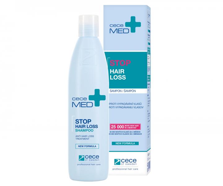 Šampón Cece Med Stop Hair Loss má zloženie špeciálne vyvinuté na mieru pre potreby padajúcich vlasov. Aktívne zložky, medzi ktoré patria proteíny z bielej lupiny, vitamín PP, biotín a vitamín E, napomáhajú k posilneniu a regenerácii oslabeného vlasového vlákna aj vlasovej pokožky a tým dochádza k zníženiu vypadávania vlasov až o 76 %. Šampón súčasne vyživuje vlasové korienky a podporuje rast nových vlasov až o 21 %. Výsledkom sú tak silnejšie vlasy plné vitality a lesku.