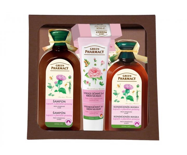 Sada proti vypadávaniu vlasov s lopúchom a pšeničnými proteínmi Green Pharmacy obsahuje: