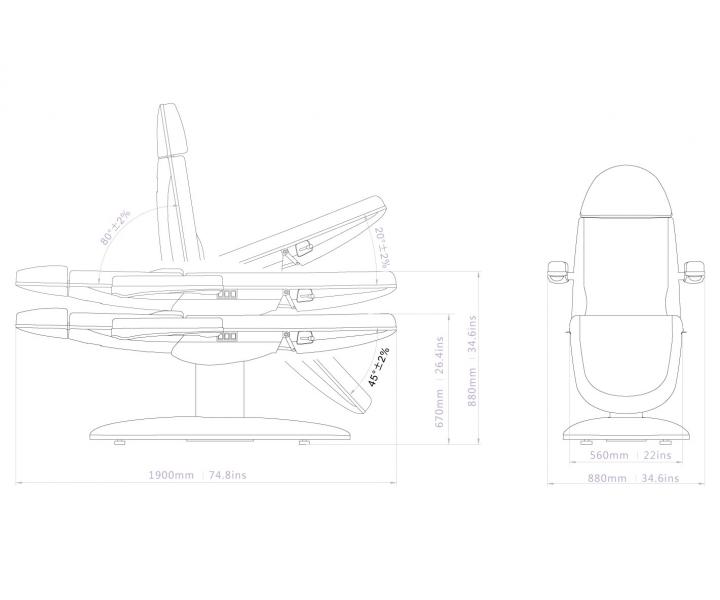 Elektricky nastaviteľné kozmetické ležadlo s minimalistickým a módnym dizajnom, so stabilnou základňou a vysokým komfortom. Lehátko má 3 motory, ktoré automaticky ovládajú všetky pohyby. Lehátko je možné nastaviť na plne vodorovnú polohu. Lehátko má aj plne nastaviteľné lakťové opierky.