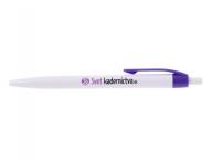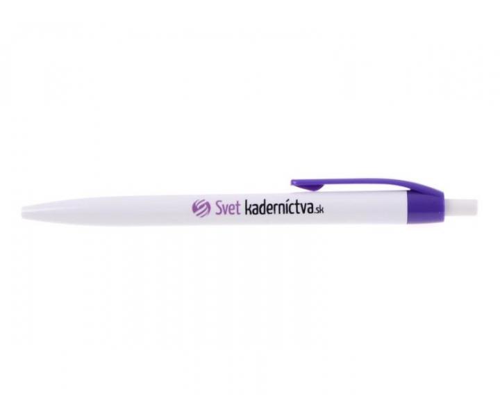 Guličkové pero s potlačou Svet kaderníctva.sk v bielej farbe s fialovými doplnkami. Prepisovačka je plastová. Tuha s modrým atramentom sa dá ľahko vymeniť.