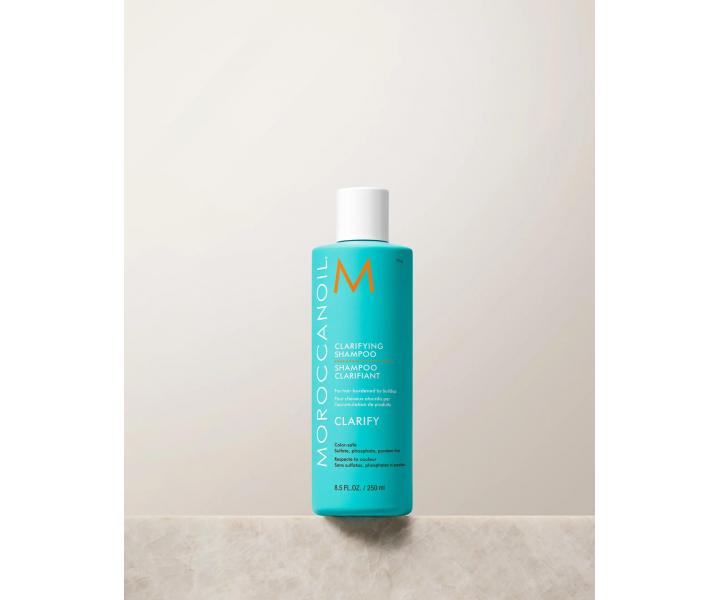 Hĺbkovo čistiaci šampón Moroccanoil Clarifying Shampoo účinne odstraňuje z vlasov každodenné nánosy vlasových a stylingových produktov, minerálne usadeniny z tvrdej vody, chlór aj nečistoty z okolitého prostredia, ktorých nahromadenie môže spôsobiť matnosť vlasov, ich plyhnutie a mastenie. Šampón svojim zložením, obohateným o arganový a avokádový olej, keratín, levanduľu, harmanček a jojobové výťažky, vlasy vyživuje, šetrne čistí, navracia im zdravú rovnováhu a beztiažnosť. Šampón je vhodný aj na farbené vlasy, pri ktorých nemá vplyv na vymývanie farby. Neobsahuje sulfáty, fosfáty ani parabény.