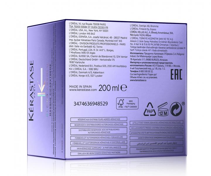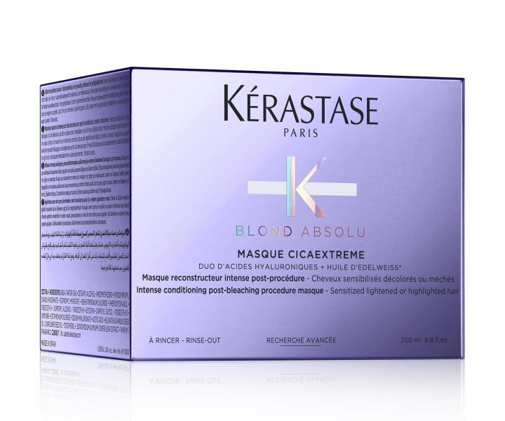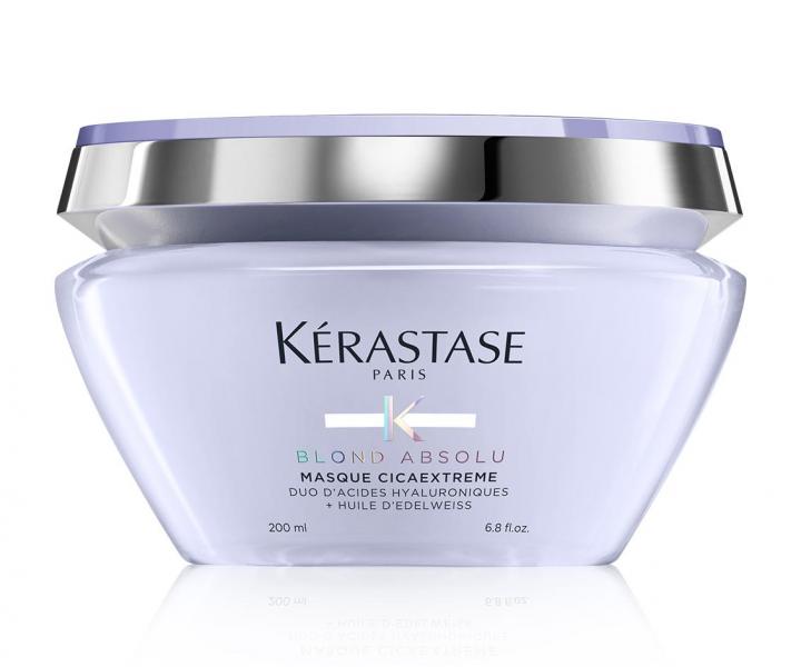 Hĺbkovo regeneračná obnovujúca maska ​​pre zcilitvělé blond vlasy Kérastase Blond Absolu Masque Cicaextreme. Intenzívne spevňuje štruktúru vlasového vlákna a obnovuje ho po odfarbenie. Vlasy sú o 94 % pevnejšie a odolnejšie. Vlákno je až o 85 % hydratovanejšie a plnšie, končeky sú zacelené. Redukuje povrchové poškodenie spôsobené odfarbením o 14 % po jedinom použití. Vlasy sú spevnené, dĺžky sú zacelené, vlasové vlákno je odolnejší.