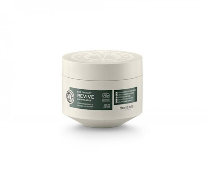 Vegánska maska bez sulfátov a parabénov Maria Nila Eco Therapy Revive Hair Masque poskytuje účinné hĺbkové ošetrenie vlasom a vlasovej pokožke, ktoré zjemňuje a hydratuje. Obnovujúce rastlinné proteíny dodávajú vlasom intenzívnu výživu, pomáhajú znižovať krepovatenie a suchosť vlasov aj vlasovej pokožky. Vlasy sú tak hodvábne jemné a poddajné, ale pritom silné. Color Guard Complex chráni vlasy pred UV žiarením a voľnými radikálmi a garantuje dlhšiu životnosť farby vlasov. Zásluhou aloe vera a ľanového extraktu, ktoré majú vyživujúci a regenerujúci účinok, je možné masku používať pravidelne. Maska má kvetinovú vôňu jazmínu a lipovového kvetu. Rad vlasovej kozmetiky Eco Therapy Revive má certifikát Cosmos Organic, ktorý garantuje, že minimálne 95 % rastlín, ktoré produkty obsahujú, je organických a najmenej 10 % z celkového zloženia produktov tvoria organické prísady.