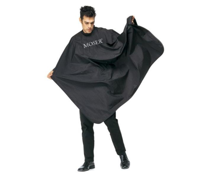 Profesionálna kadernícka pláštenka Moser 0092-0141 na strihanie s upevnením na suchý zips so strieborným nápisom výrobca. Farba: čierna Materiál: 100% polyester Rozmer: 135 x 150 cm Vlastnosti: - antistatická - vodeodolná