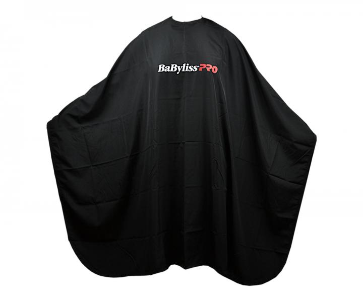 Profesionálna kadernícka pláštenka na strihanie BaByliss Pro v čiernej farbe s logom značky na prednej strane. Pláštenka má zapínanie na cvoky a praktické pútko na zavesenie.