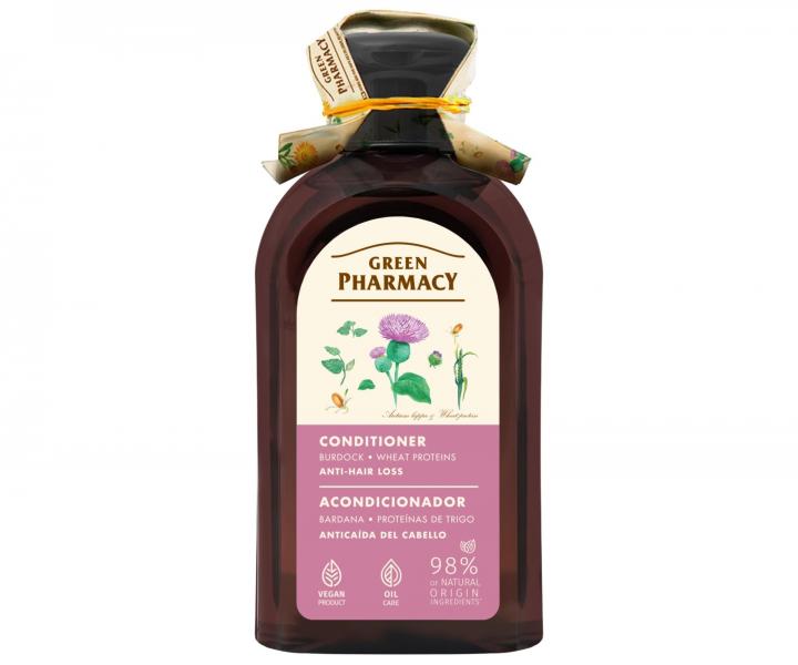 Kondicionér proti vypadávaniu vlasov Green Pharmacy obsahuje lopúch a pšeničné proteíny. Kondicionér je vhodný pre všetky typy vlasov. Dodáva vlasom lesk a uľahčuje rozčesávanie vlasov. Zabraňuje nadmernému vypadávaniu vlasov.
