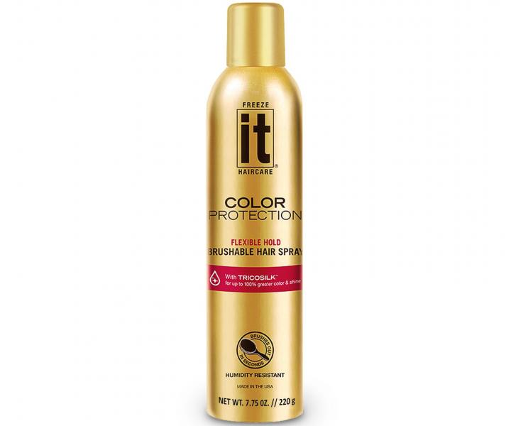 Lak pre farbené vlasy Freeze It Haircare Color Protect Flexible Hold pomocou formule TRICOSIL zaisťuje ochranu farby. Pevne drží účes a dodáva vlasom potrebný lesk. Lak je odolný proti vlhkosti, vlasy zostávajú jemné a ľahké. Hnedým vlasom zabezpečí sýtosť farby, červenej rozžiaria, čierne oživí a blond vlasom zosilnie prirodzený blond vzhľad. Nelepí a zabraňuje krepovateniu.