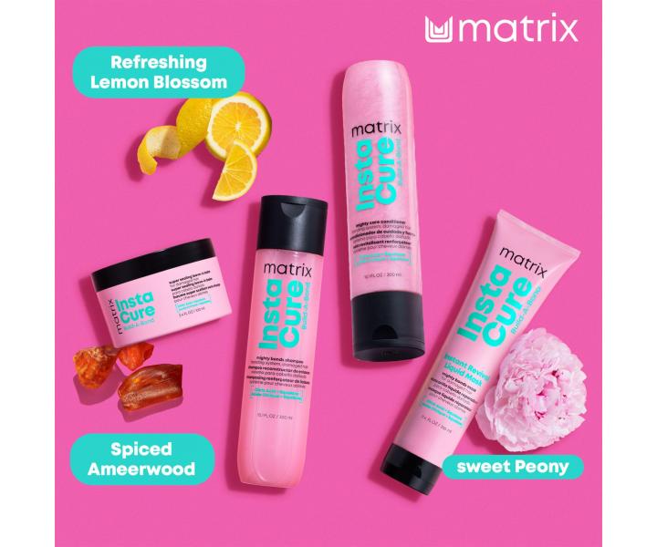 Obnovujúci kondicionér Matrix Instacure Build-A-Bond Mighty Care Conditioner viditeľne napravuje poškodenie vlasov a zanecháva ich hebké a uhladené. S pomocou kyseliny citrónovej a skvalanu vytvára nové vlasové väzby, a tak obnovuje aj veľmi poškodené vlasy. Kyselina citrónová preniká hlboko do vlasových vlákien, kde ich posilňuje zvnútra a zanecháva ich až 8x pevnejšie, zatiaľ čo skvalan ich okamžite uhladzuje a zanecháva zamatovo hebký každý prameň. Inovatívny kondicionér uľahčuje rozčesávanie vlasov, dodáva im výživu a žiarivý lesk bez toho, aby ich zaťažoval. Zloženie kondicionéru je vegánske, bez obsahu sulfátov, parabénov a minerálnych olejov, vhodné aj pre farbené a melírované vlasy. Kondicionér s luxusnou krémovou textúrou zanecháva vo vlasoch nezabudnuteľnú vôňu osviežujúcich citrusových kvetov, ambrového dreva, fíg a sladkých pivoniek.