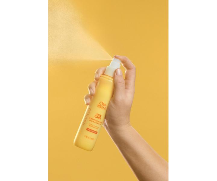 Ochranný sprej Wella Professionals Invigo Sun Care UV Protecting Spray chráni vlasy pred UV žiarením a blednutím farby a zároveň ich pomáha hydratovať. Rovnako ako počas leta chránime pokožku pred slnkom, je potrebné chrániť pred slnkom aj naše vlasy. Slnko, slaná voda, piesok a vietor vlasy vysušujú a poškodzujú. Pri pobyte na slnku dochádza vo vlasoch vplyvom UV žiarenia k oxidačnému procesu, ktorý spôsobuje vznik voľných radikálov, poškodenie štruktúry vlasov a blednutie farby. Ochranný sprej obohatený o vitamín B5 dodáva vlasom potrebnú hydratáciu a starostlivosť pred a počas pobytu na slnku. Rad Invigo Sun je ideálny na letnú dovolenku k moru, ale aj keď často zdržiavate na slnku alebo navštevujete bazény s chlórovanou vodou. Ľahký sprej s veľmi príjemnou pomarančovou vôňou je vhodný pre všetky typy vlasov. Obal je z 80 % vyrobený z recyklovaného plastu.