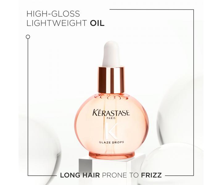 Olej Kérastase Gloss Absolu Glaze Drops Oil ponúka štvordňovú ochranu proti krepateniu a okamžitý lesk, ktorý je dvakrát intenzívnejší ako u bežných produktov. Vďaka ľahkej textúre obohatenej o olej z divokej ruže uhladzuje nepoddajné vlasy a dodáva im oslnivý lesk bez zaťaženia. Tento olej je bohatý na vitamíny a antioxidanty, ktoré vyživujú pokožku hlavy aj vlasy, obnovujú ich hydratáciu a podporujú zdravý rast. Aktívne zložky, ako kyselina hyalurónová a kyselina glykolová, vyhladzujú vlasy a zlepšujú ich štruktúru, takže vlasy zostávajú hladké a svieže. Precízny aplikátor zaistí dokonalý výsledok a dlhotrvajúcu ochranu proti krepateniu. Olej okamžite zvyšuje lesk, vyživuje a hydratuje zvlnené či poškodené dĺžky bez toho, aby zanechal mastný pocit. Vlasy zostávajú prevoňané jedinečnou, neodolateľnou vôňou, zatiaľ čo textúra je jemná, ľahká a ošetrujúca. Ľahký olej je vhodný pre všetky typy vlasov, vrátane jemných, ale najmä pre husté a krepaté vlasy. Nezaťažuje vlasy, má číru, ľahkú a ošetrujúcu textúru. Olej je vegánsky a krásne vonia po sviežich citrusových tónoch, santalovom dreve a vanilke.