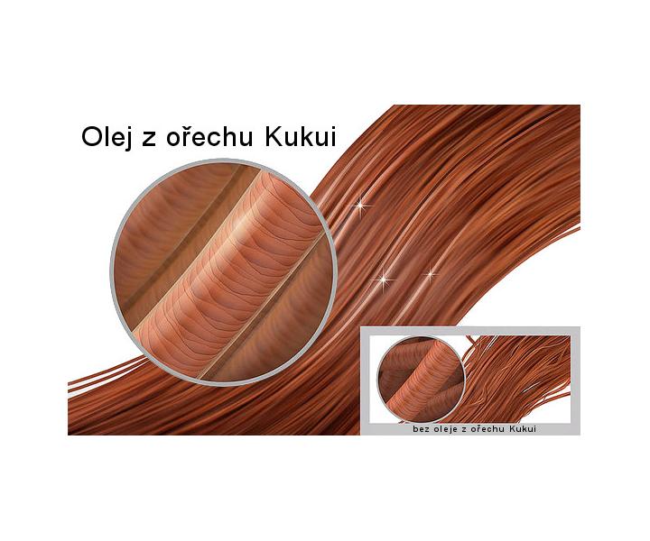 Olej z orecha Kukui - preniká do vlasového vlákna, poskytuje intenzívnu hydratáciu a vyživuje suché a poškodené vlasy, čím zlepšuje ich textúru