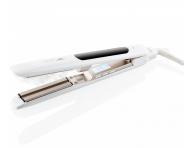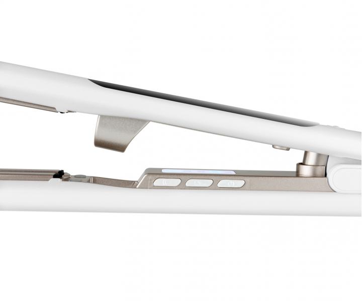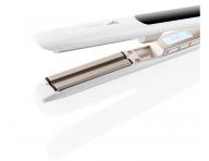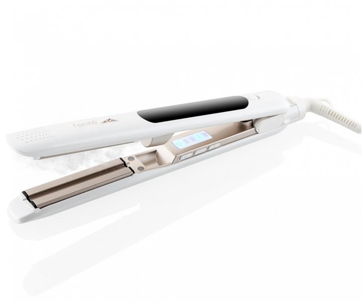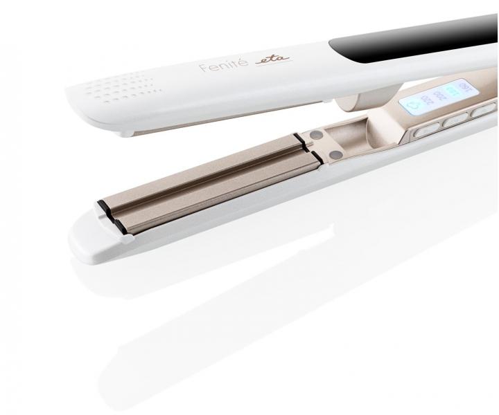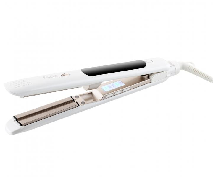 Žehlička na vlasy s naparovaním ETA Fenité 3337 má plávajúce keramicko-turmalínové doštičky, ktoré sú veľmi šetrné k vlasom. Dostatočný teplotný rozsah od 160 °C do 220 °C dokáže narovnať všetky typy vlasov. O aktuálne zvolenej teplote informuje svetelná signalizácia. Žehlička disponuje žehlením s parou, objem nádržky na destilovanú vodu je 7,5 ml, čo je množstvo, ktoré vám zaistia až 20 minút pary. Pomocou pary vlasy upravíte rýchlejšie a účinnejšie. Nádržka je ľahko vyberateľná. Funkciu pary možno ľahko vypnúť pomocou tlačidla priamo na žehličke. Ľahkú manipuláciu umožňuje otočný kábel. Ak sa žehlička nepoužije po dobu 30 minút sa automaticky vypína. Má uzamykateľné žehliace plochy a praktické pútko na zavesenie. Súčasťou balenia je cestovné púzdro.