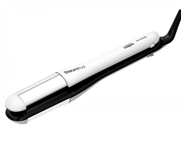 Multifunkčná parná žehlička na vlasy Loréal Professionnel SteamPod 4 umožňuje až 3x rýchlejšie žehlenie, 2x uhladenejší výsledok a až od 95 % menšie poškodenie vlasov (v porovnaní so SteamPod 4 bez pary a hrebienka). Vďaka novému ergonomickému dizajnu sa žehlička dostane až o 30 % bližšie ku korienkom vlasov. Extra plávajúca horná žehliaca doštička zaisťuje optimálnu priľnavosť ku všetkým typom vlasov. Žehliace doštičky sú keramické a sú potiahnuté vrstvou hliníka, ktorý zvyšuje ich odolnosť a to aj v prípade intenzívneho používania žehličky. Žehlička má teplotné nastavenie od 180 °C do 210 °C a je tak vhodná pre všetky typy vlasov. Múdra regulácia teploty kontroluje teplotu doštičiek až 250x za sekundu, čím je zaistené rovnomerné zahriatie doštičiek. Parná technológia rozptyľuje až 0,8 g pary za minútu pre viditeľne hladší výsledok žehlenia a jedno naplnenie nádržky na vodu vystačí na vyžehlenie až 192 metrov vlasov. Žehlička je tiež vhodná na vytváranie vlnitého stylingu vlasov vďaka nahrievacím plochám na vonkajších stranách tela žehličky, ktoré sa zahrievajú na 100 °C a je možné s nimi vytvoriť výrazné a pružné vlny. Tieto plochy je možné pre bezpečnosť zakryť teplovzdornými krytmi, ktoré sú súčasťou balenia. Súčasťou balenia sú aj 3 hrebienky o rôznych šírkach zubov, ktoré optimalizujú rozptyl pary podľa typu vlasov. Manipuláciu so žehličkou uľahčuje 2,5 metrov dlhý a o 360 ° otočný kábel. Bezpečnosť je potom zaistená automatickým vypnutím žehličky po 30 minútach nečinnosti. Pri cestovaní sa môže hodiť teplovzdorné cestovné puzdro.