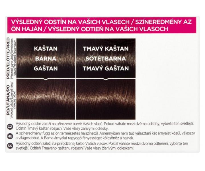 Preliv bez amoniaku Loréal Paris Casting Créme Gloss poskytuje intenzívnu žiarivé odtiene až na 32 umytí. Škála prirodzených farieb rozžiari Vaše vlasy a poskytne im vynimočné odlesky. Optimálne kryje prvé šedivé vlasy a posilňuje vlasové vlákno od korienkov ku končekom. Zloženie obohatené o materskú kašičku zanecháva vlasy až 4x lesklejšie. Vďaka krémovej konzistencii farba nesteká, aplikácia je jednoduchá a ako bonus má jemnú ovocnú vôňu. Preliv je vhodný pre všetky typy vlasov - farbené, prirodzené i melírované.