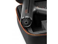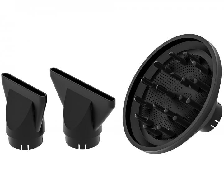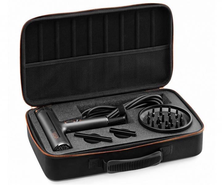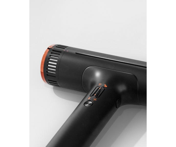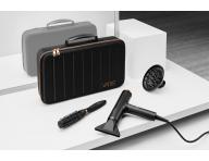 Profesionálny fén na vlasy Varis AirQ Hair Dryer na prvý pohľad zaujme svojim inovatívnym a moderným designom, ale aj svojou komplexnosťou a výkonom. Fén disponuje motorom s výkonom až 1800 W a rýchlosťou 110 000 otáčok za minútu. Úzky tvar fénu umožňuje násobiť tzv. Venturiho efekt - teda šírenie intenzívnejšieho prúdu vzduchu, ktorý je možné vďaka vákuovému efektu docieliť bez nutnosti spotreby väčšieho množstva energie. Na rukoväti fénu sa nachádzajú tlačidlá pre nastavenie teploty a rýchlosti vzduchu. Tá umožňujú nastaviť jednu z troch možností rýchlosti vzduchu a jednu zo štyroch možností teploty vzduchu. O zvolených hodnotách informujú LED diódy pri príslušnom tlačidle. Nechýba ani samostatné tlačidlo studeného vzduchu na zafixovanie účesu. Aby v priebehu fénovania nedošlo k nechcenému prenastaveniu hodnôt, je fén vybavený funkciou automatického uzamknutia tlačidiel, ktorá sa sama aktivuje 8 sekúnd po nastavení požadovaných hodnôt. Pre deaktiváciu tejto funkcie stačí pridržať tlačidlo s obrázkom zámku. Pre šetrnejšie vysúšanie vlasov je trubica fénu napustená hydroiontovými kryštálmi, tie vlasom dodávajú hydratáciu a ošetrujú ich. Odnímateľný filter fénu zachytí aj tie najmenšie čiastočky a nečistoty z okolitého vzduchu, čím chráni motor fénu a predlžuje jeho životnosť. Funkcia automatického čistenia udržuje fén čistý a vždy pripravený na použitie. Súčasťou balenia sú dve vzduchové trysky a difuzér. Fén aj príslušenstvo sú uložené v praktickom pevnom kufríku so zapínaním na zips.