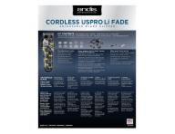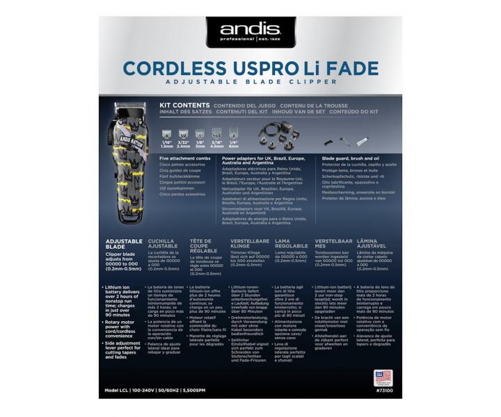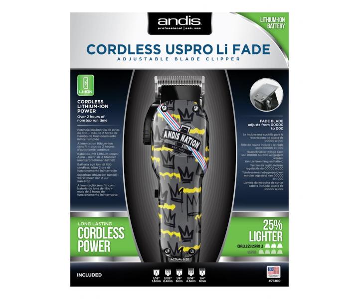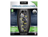 Profesionálny strojček na vlasy Andis Cordless UsPro Li Fade je ľahký a vysoko výkonný strojček so silným elektromagnetickým motorom (5500 ot./min.). Jeho ergonomický tvar vám skvele padne do ruky a pomocou integrovanej aretovacie páčky môžete plynule nastavovať výšku strihu od 0,2 mm - 0,5 mm. Strojček môžete použiť s káblom alebo bezdrôtovo až na dobu 120 minút, doba napájania je 90 minút. Strihacie hlavice s dĺžkou 45 mm je chromavaná a vysoko odolná.