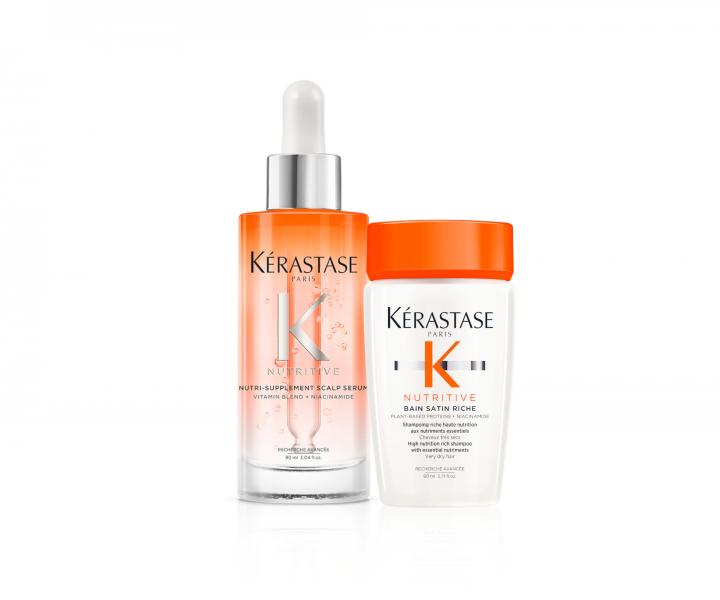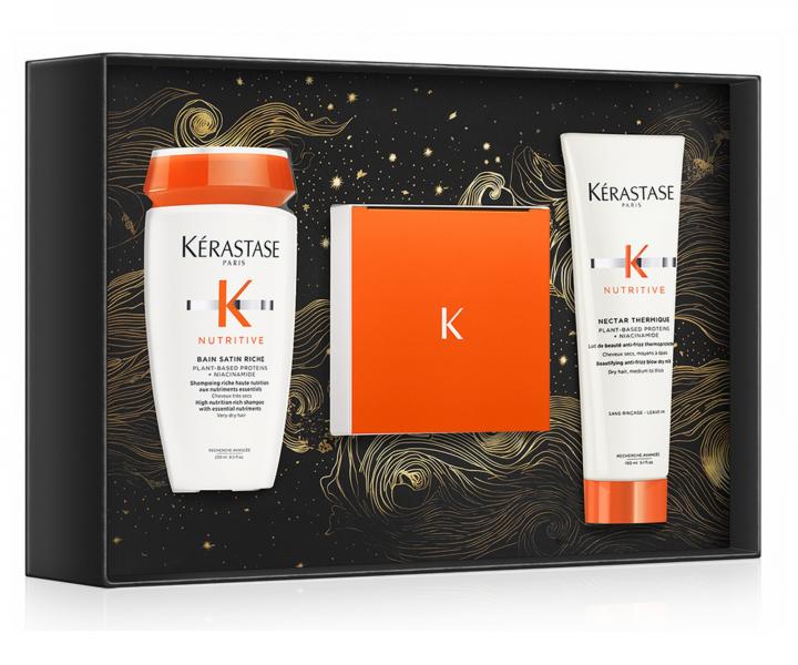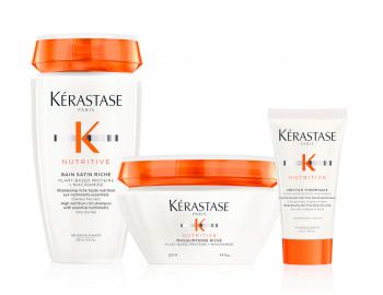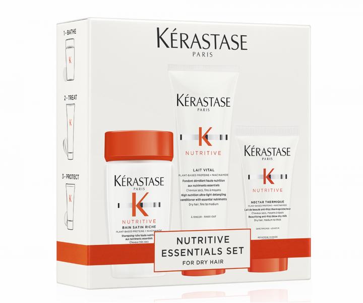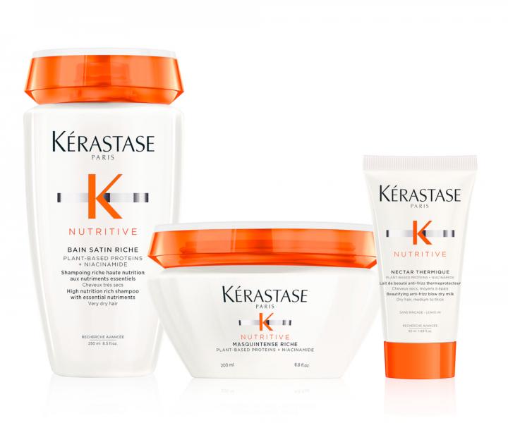 Rad pre suché a veľmi suché vlasy Kérastase Nutritive máme v ponuke vo viacerých variantoch - typ darčeková cestovná súprava - šampón + starostlivosť + termoochrana, darčeková sada - šampón + maska, darčeková sada - vyživujúci šampón - vyživujúca maska - termoochranné mlieko, hĺbkovo vyživujúca maska pre veľmi suché vlasy - 200 ml, hydratačné sérum pre zdravú vlasovú pokožku - 90 ml, hydratačný šampón - 250 ml, intenzívne vyživujúca maska - 200 ml, intenzívne vyživujúce sérum na rozstrapkané končeky - 50 ml, intenzívne vyživujúci šampón - 250 ml, intenzívne vyživujúci šampón - 500 ml, intenzívne vyživujúci šampón - 500 ml, náhradná náplň, ľahký intenzívne vyživujúci a hydratujúci kondicionér - 200 ml, nočné vyživujúce sérum - 90 ml, sada - vyživujúci šampón + vyživujúca maska + termoochrana 50 ml zadarmo, termoochranná ošetrujúca hmla pre ľahké rozčesávanie - 150 ml a termoochranné mlieko proti krepovateniu - 150 ml. Na tejto strane nájdete prehľad všetkých verzií - parametrom členenie je typ. Rad pre suché a veľmi suché vlasy Kérastase Nutritive v predaji od 24,38 € do 73,21 € so zľavou až 7 %.