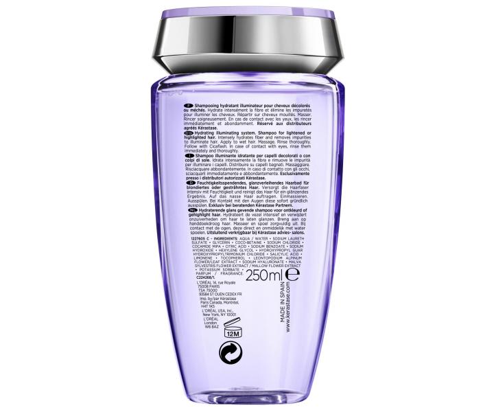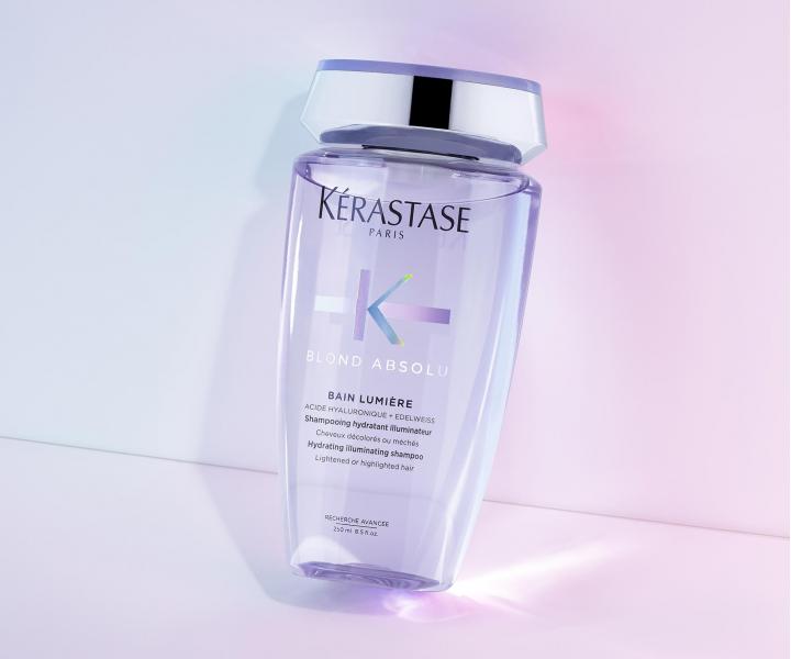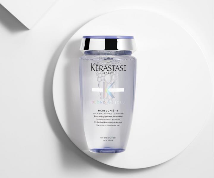 Šampónový kúpeľ Kérastase Blond Absolu Bain Lumiére je špeciálne vyvinutý pre potreby zosvetlených a melírovaných vlasov. Rozjasňuje blond tóny bez zmeny odlesku. Intenzívne hydratuje vlasové vlákno a odstraňuje nečistoty. Zanecháva vlasy ľahké a prirodzene žiarivé. Vyhladzuje vlasové vlákno pre jednotný dotyk od korienkov po končeky. Zloženie obohatené o kyselinu hyaluronovú a kvet plesnivce alpského zjemňuje vlasové vlákno, lieči trhliny vnútri vlasového vlákna a zaceľuje jeho povrch. Šampón je vhodný na každodenné použitie.