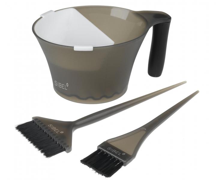 Sada na farbenie vlasov Sibel obsahuje základné pomôcky na farbenie a melírovanie vlasov - vhodné pre farbenie s dvoma odlišnými farbami. Sada obsahuje misku s oddelenou menší miskou a dva štetce na farbenie vlasov. Miska má vyznačené rysky pre presné odmeranie farby. Miska má protišmykové madlo pre bezpečnú manipuláciu pri miešaní a aplikácii. Balenie obsahuje dva štetca vo veľkosti S a L.