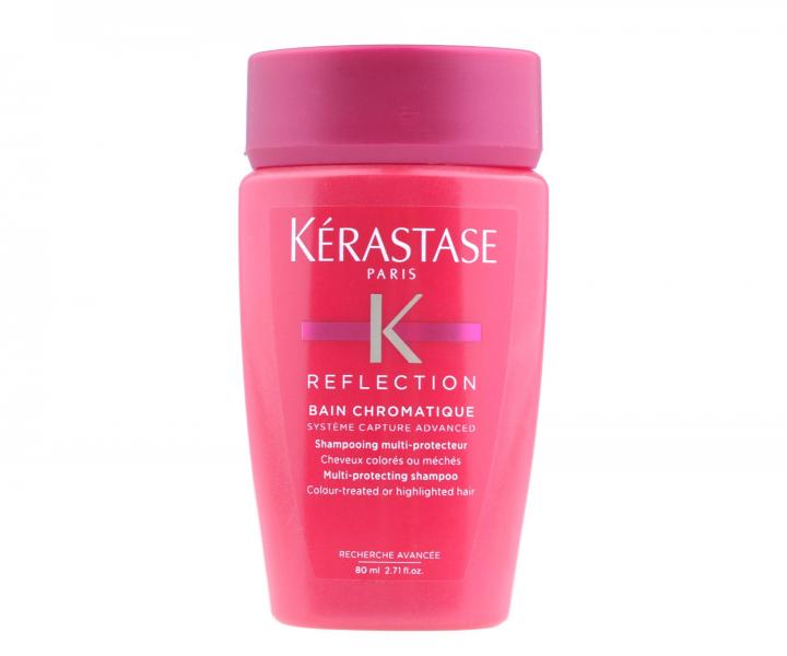 Multi-ochranná šampónová kúra pre farbené alebo melírované vlasy Kérastase Reflection Bain Chromatique uzamyká farbu pre dlhodobú žiarivosť a lesk farby. Obnovuje a vyživuje vlasové vlákno. Výsledkom sú jemné a hebké vlasy.