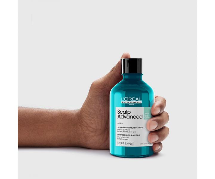 Šampón pre mastiacu sa vlasovú pokožku Loréal Professionnel Serie Expert Scalp Advanced Anti-Grass Oiliness Shampoo pôsobí ako ochranný film proti vonkajším nečistotám a obnovuje rovnováhu vlasovej pokožky. Má unikátne prečisťujúce zloženie obsahujúce 3% kyselinu AHA, ktorá je rozpustná vo vode, a íl. Tieto zložky spoločnou silou redukujú tvorbu kožného mazu až o 78 %. Táto receptúra tiež odstraňuje z pokožky hlavy aj vlasových vlákien nežiaduce rezíduá a pot. Šampón tak prináša vlasovej pokožke pocit dokonalej čistoty a sviežosti.