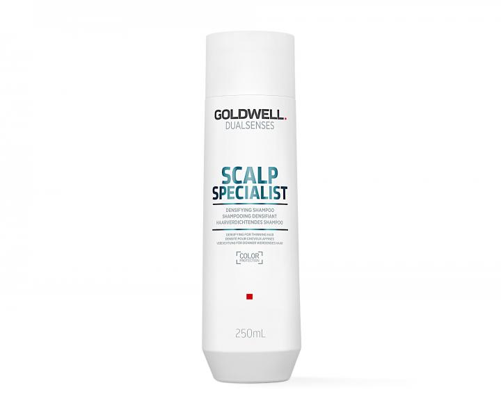 Šampón pre rednúce vlasy Goldwell Dualsenses Scalp Specialist Densifying Shampoo okamžite osviežuje a aktivuje pokožku hlavy. Dodáva pocit sviežosti a čistoty vlasov a pokožky hlavy. Vlasom poskytuje okamžitú pevnosť a tie potom vyzerajú hustejšie. Šampón vďaka inovatívnej technológii microPROtec complex rýchlejšie a rovnomernejšie zásobuje vlasy základnými ingredienciami a tým aj chráni farbu vlasov proti vyblednutiu. Kofeín, ktorý je obsiahnutý v zložení šampónu, napomáha aktivovať a revitalizovať vlasové cibuľky, vytvára sa tak dokonalý základ pre hustejšie a pevnejšie vlasy. Šampón je vhodný každodenné použitie a pre všetky typy vlasov.