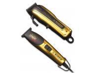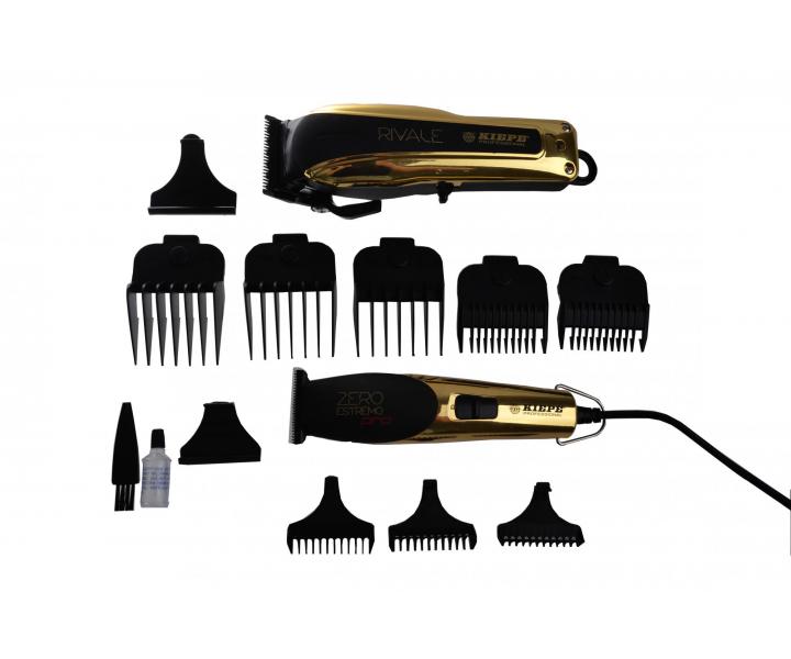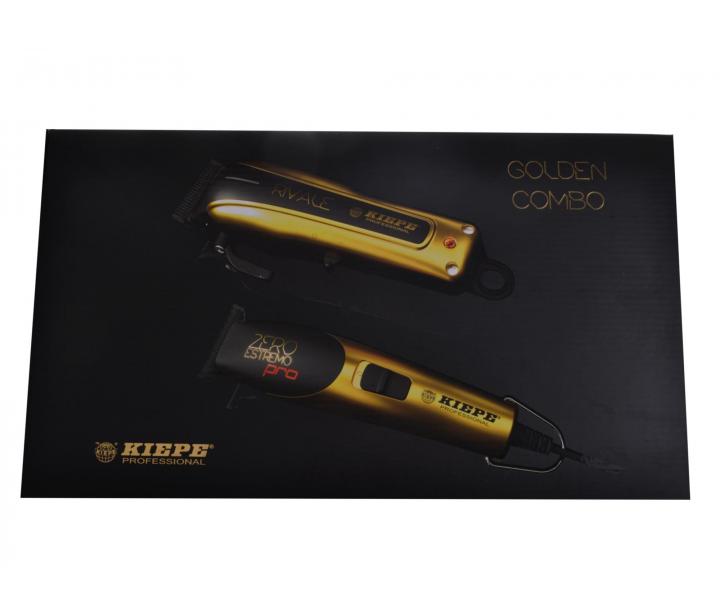 Set profesionálnych strojčekov na vlasy obsahuje akumulátorový strojček Kiepe Rivale a sieťový kontúrovací strojček Kiepe Zero Estremo, oboje v luxusnom zlatom prevedení.