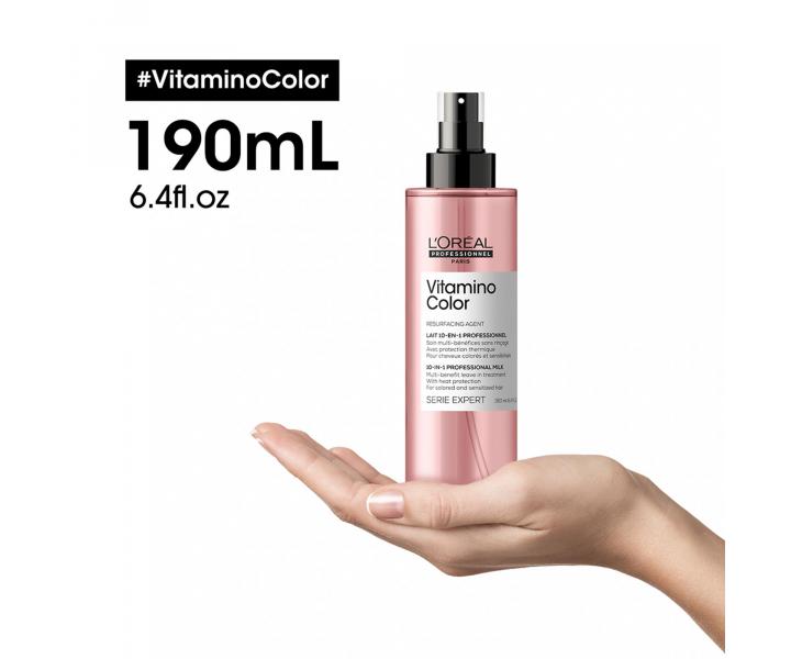 Sprej Loréal Serie Expert Vitamino Color na všetky typy farbených vlasov. Zloženie obohatené o neohespiridin, tocopherol, panthenol a UV filter pomáha chrániť vlasové vlákno pred vonkajšími vplyvmi a podporuje lesk farby. Poskytuje 10 okamžitých výhod: 1. ochrana až do 230 °C, 2. lesk, 3. jemnosť, 4. posilnenie vlasového vlákna, 5. hebkos... viac »