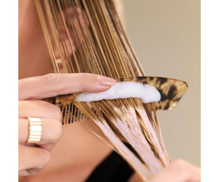 2. Naneste rovnomerne do umytých a uterákom vysušených vlasov od korienkov ku končekom.