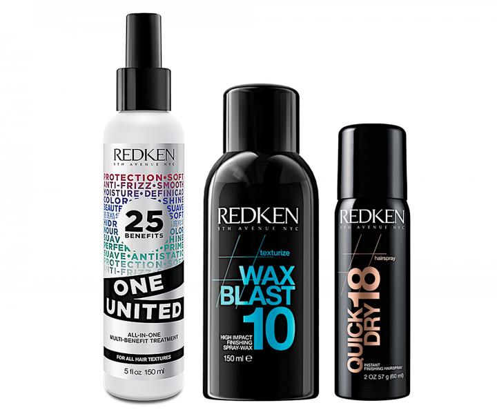 Stylingová sada Redken obsahuje: Ošetrujúci sprej s 25 benefitmi Redken One United - 150 ml Vosk v spreji Redken Wax Blast 10 - 150 ml + Lak na vlasy s maximálnou fixáciou Redken Quick Dry 18 - 60 ml ZADARMO