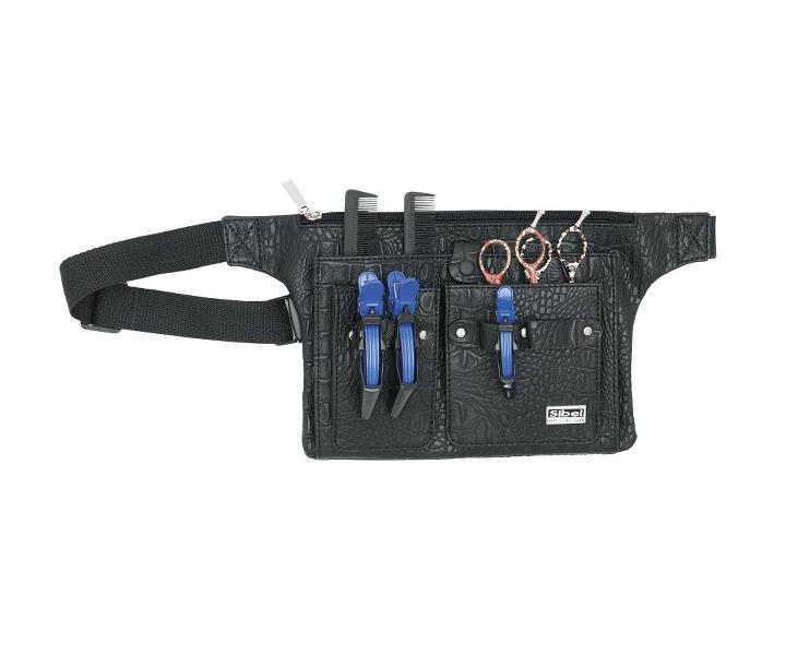 Profesionálna brašňa Sibel z veľmi kvalitnej umelej kože so vzorom krokodíla na nožnice a iné potreby má jednu veľkú kapsu na zips, jednu veľkú kapsu na cvok a dve menšie vrecká vrátane variabilného popruhu okolo pása. Malé vrecká majú vnútri uchytenie pre nožnice a väčšie vrecko na cvok má vnútri štyri priehradky pre hrebene alebo iné príslušenstvo. Taška má elegantný dizajn a je veľmi priestranná, preto si ju obľúbia každý kaderník.