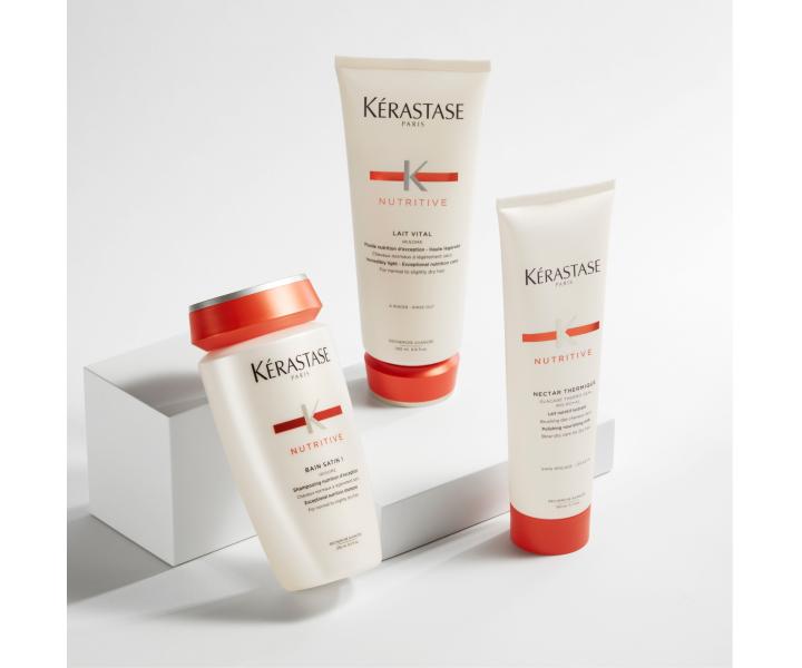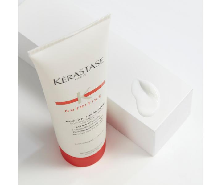 Termoochranná starostlivosť Kérastase Nutritive Nectar Thermique uhlazuje, vyživuje a dodáva ochranu pred teplým suchým, veľmi suchým a citlivým vlasom. Dodává jim lesk, hebkost a ponúka ich úpravu. Chrání vlasy pred vplyvom tepla pri fénovaní a žehlení. Vyživuje, změkčuje a hydratuje suché vlasy. Posiluje pevnosť vlasov a zachováva si ich.