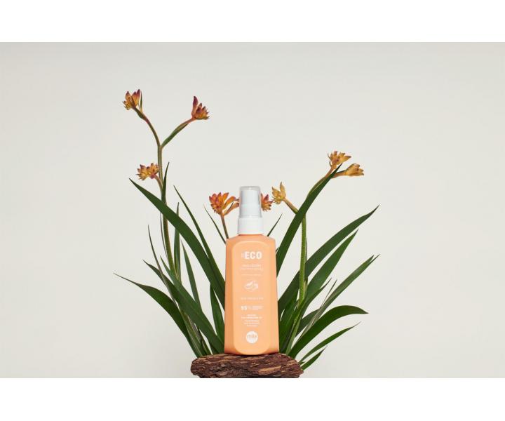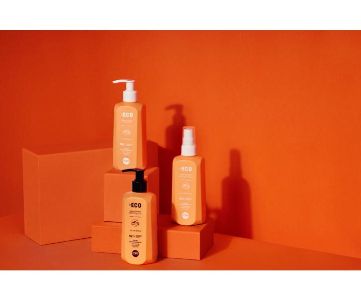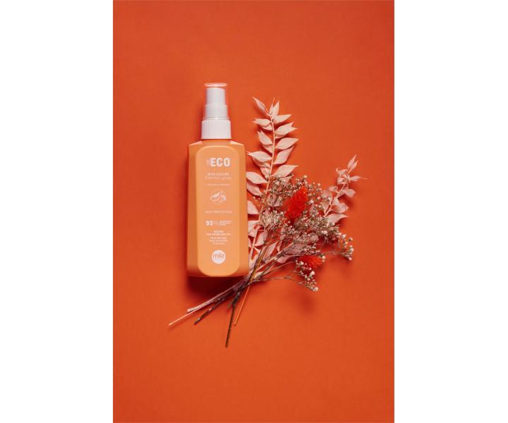 Termoochranný sprej Mila Professional Be Eco Vivid Colors Thermo Spray je ideálnou voľbou pre farbené vlasy. Unikátna receptúra spreja má kyslé pH, ktoré pomáha uzatvárať šupinky kutikuly vlasov, čo prispieva k udržaniu maximálnej intenzity farby a zaisťuje, že vlasy budú mäkké, uhladené a žiarivé. Sprej má ľahké zloženie, ktoré je z 95 % zložené z prírodných ingrediencií. Navyše neobsahuje SLS a SLES, jeho obaly sú vyrobené z cukrovej trstiny a je teda úplne vegánsky. Rastlinné proteíny v spreji plnia funkciu tepelnej ochrany, pretože vytvárajú na vlasoch ľahký povlak, ktorý zabezpečuje ochranu pred škodlivým pôsobením vysokých teplôt až 230 °C. Vďaka tejto ochrane sú vlasy posilnené, odolné proti krepovateniu a sprej disponuje aj antistatickým efektom. Humektanty, ktoré sú tiež súčasťou zloženia, upravujú hladinu hydratácie a dodávajú vlasom krásny lesk. Sprej tak dokonale uľahčuje tvorbu účesu a má príjemnú vôňu papáje a manga.