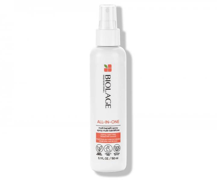 Viacúčelový sprej na vlasy Biolage All-In-One využije naozaj každý. Je vhodný pre všetky typy vlasov - rovné, vlnité, kučeravé, jemné alebo hrubé. Môžete ho použiť na mokré i suché vlasy, ktorým dodáva lesk, chráni ich pred teplom, zabraňuje krepovateniu a štiepeniu končekov. Vaše vlasy zahalí krásnou kvetinovou vôňou s tónmi mandarínky, ruže a santalového dreva. Neobsahuje parabény, sulfáty, umelé farbivá, ťažké vosky a je vhodný pre vegánov. Dodáva okamžité výsledky, takže už žiadne čakanie.