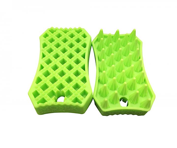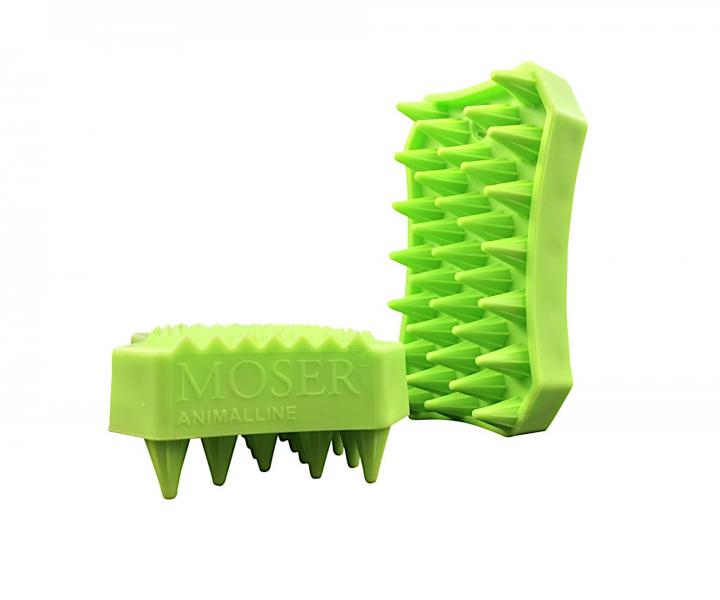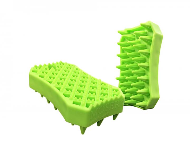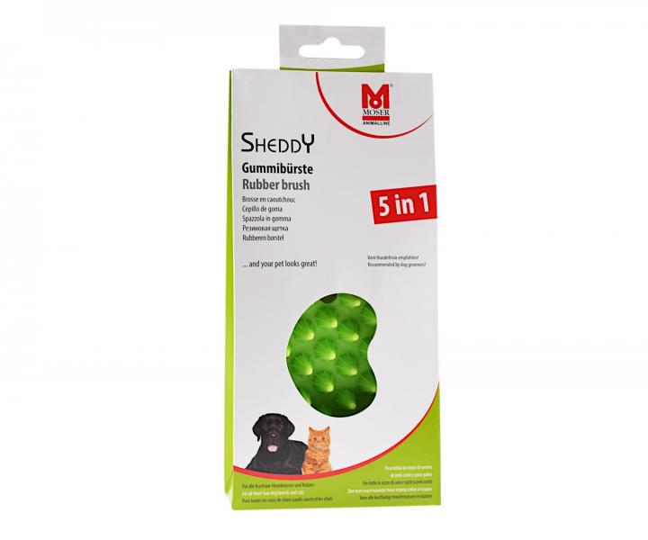 Obojstranná gumová kefa Moser Sheddy odstráni zo srsti uvoľnené chlpy a nečistoty a súčasne jemne masíruje pokožku a podporuje cirkuláciu krvi. Kefa má mäkké gumové hroty dvoch veľkostí (malé a veľké), ktoré sú šetrné k srsti aj k pokožke, vďaka čomu je vhodná aj pre citlivé zvieratá. Kefu možno využiť na suchú aj mokrú srsť, na nanesenie šampónu pri umývaní alebo na odstraňovanie chlpov z oblečenia. Pri pravidelnom používaní kefy dosiahnete zdravú a lesklú srsť. Kefa je určená pre všetky plemená psov a mačiek s krátkou srsťou.
