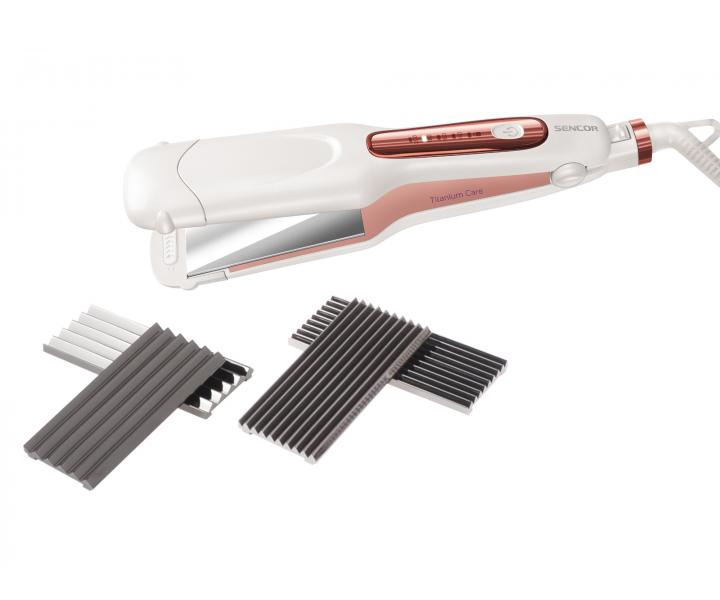 Žehlička a krepovačka na vlasy 2v1 Sencor v perleťovo bielej farbe v kombinácii s ružovou sa stane štýlovým pomocníkom pre úpravu vašich vlasov. Balenie obsahuje 3 vymeniteľné plochy pre žehlenie a krepovanie a vy si tak užijete účes podľa nálady. Nastaviteľná teplota chráni vaše vlasy a indikátor teploty uľahčuje nastavenie. Povrch žehliacich a krepovacích plôch je potiahnutý titánom. Naviac je ultra ľahká a nezaťažuje tak ruky. Žehlička a krepovačka 2v1 disponuje funkciou zámku teploty počas používania a funkciou automatického vypnutia.